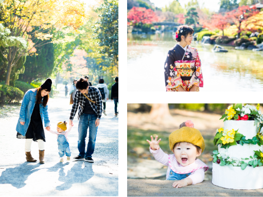 公園や屋外などでの記念写真や家族写真や、入学卒業式の出張撮影など
